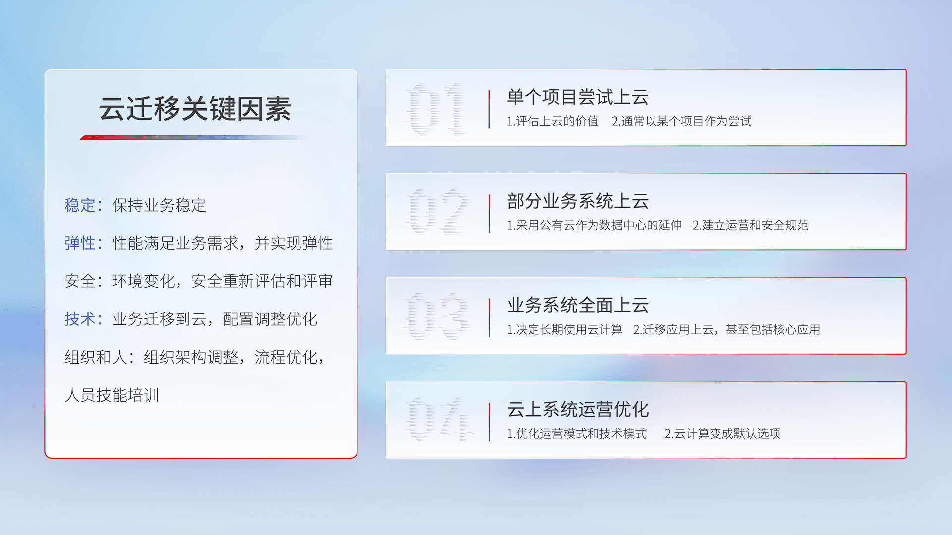 结合实际业务,,,,从规划设计、、、云平台选型、、云原生改造、、数据迁移、、、、集成交付,,,迁移全过程为客户识别最佳上云路径,,做好风险识别管理,,,设计网络架构、、、身份权限、、、安全审计合规、、、操作审计、、、、日志审计、、、、监控告警策略、、、、多站点容灾设计等,,,,对云上基础设施进行整体规划,,提升IT治理水平,,,,以满足弹性、、高可用、、高性能的需求。。。