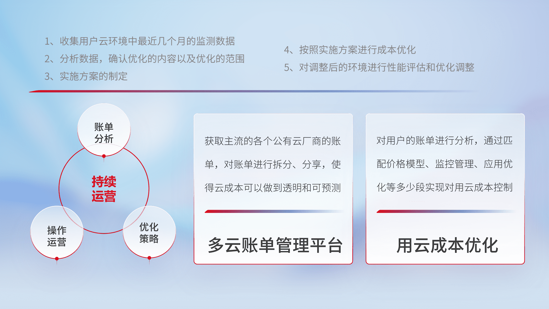 通过多云纳管,,,,以统一的资源数据模型把客户的云资源进行抽象和封装,,进而实现对多云资源的统一操作,,保障云资源管理的可靠性、、、、稳定性与可用性。。量身定制化运维内容,,,,配置、、开发运维、、补丁管理、、、、备份、、监控、、、、认证和访问管理、、、审计和日常巡检等,,,保障在用云过程中的可靠度,,,稳定度以及高可用率。。。